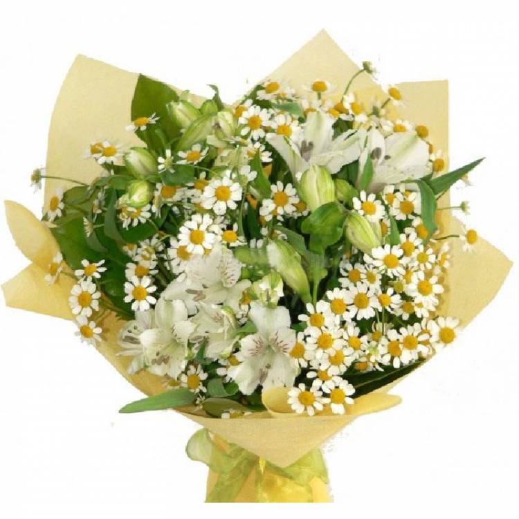В этом букете тепло и наивность милых луговых ромашек объединены с изысканностью альстромерий. Композиция очаровывает своей элегантностью и незамысловатостью. В то же время здесь явно чувствуется выраженная дарителем оригинальность и признательность к человеку, которому предназначен букет. Универсальность букета делает его отличным подарком для многих мероприятий.